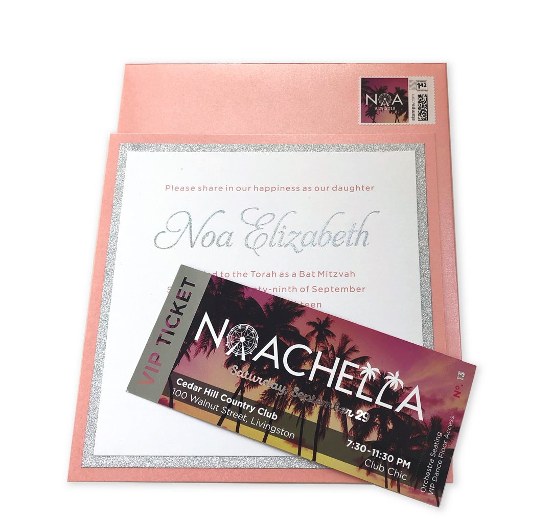 To accompany the more formal blush, white, and silver synagogue service invitation (from Stationery Stephanie), a custom “VIP ticket” to Noachella was created. The longer logo was set against a photo of palm trees at sunset, and silver foil highlights were added to echo the shimmering formal invitation. For an official look, the tickets were printed on heavy gloss stock with a perforated, ticket stub end. All tickets were number 13, appropriately.