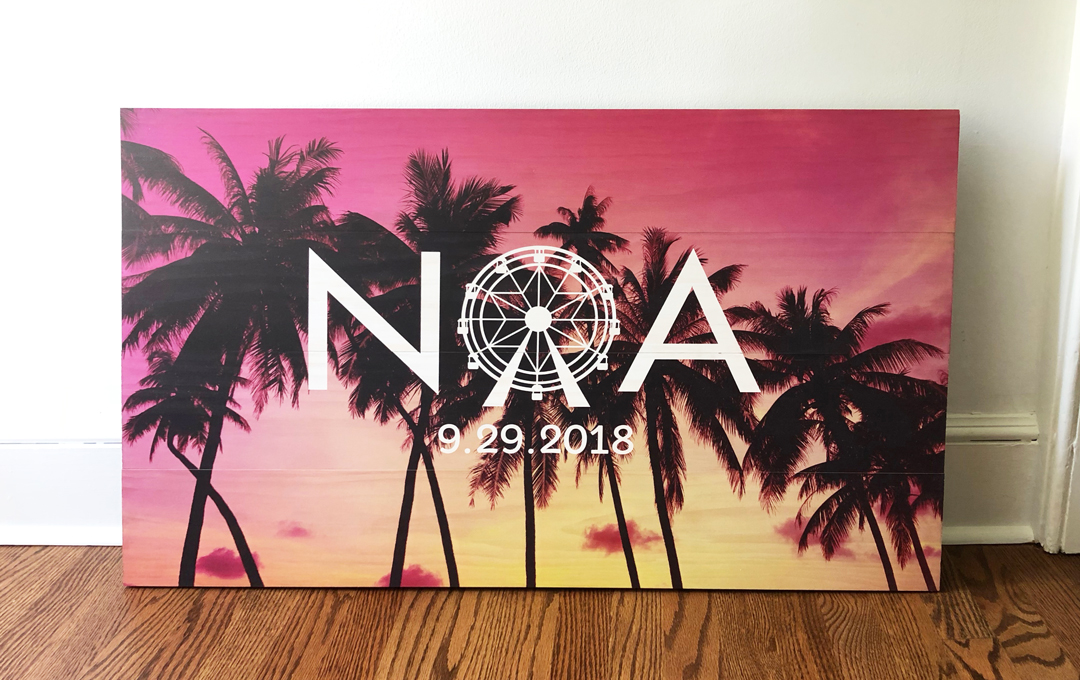 A sign-in board was created with the help of Boaz Fields, who printed the logo and palm tree photo onto a 2-foot by 3-foot pallet of reclaimed wood. This sign was mounted on an easel at the entrance to the party, with gold and silver Sharpies within reach.