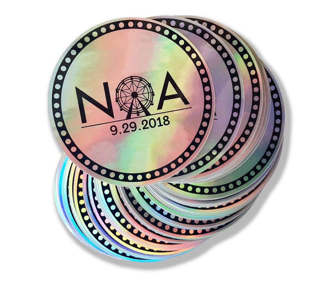 Because nobody can resist a cute sticker, especially a holographic one, ordered a stack of trippy logo stickers from StickerApp. These later became party favors.