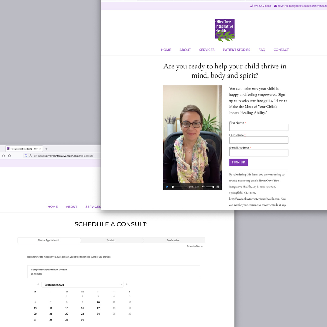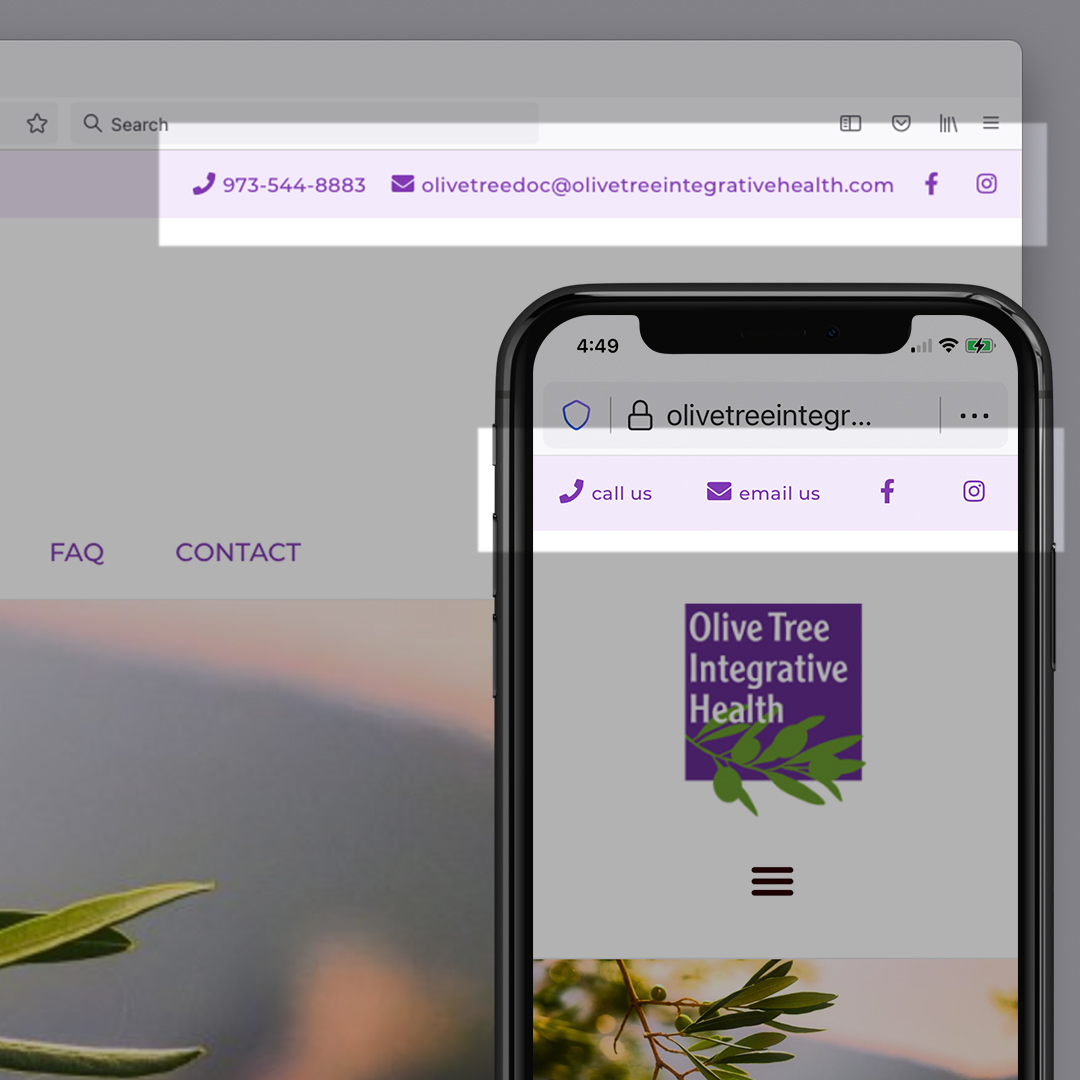 The new Olive Tree Integrative Health website features bright photos and a calming color palette, setting a soothing tone for site visitors who may be parents of chronically ill children. The site is thoughtfully responsive; page layouts are optimized for different devices and screen sizes. For instance, the site’s header on a wide desktop or laptop screen spells out the office’s full phone number and email address, while the small-screen phone view condenses these long phrases to clickable “call us” or “email us” links. Most DIY systems and website templates do not easily support this level of customization, instead trying to accommodate small screen sizes by shrinking type to tiny text or stacking the header vertically, taking up a disproportionate amount of already-limited space.
