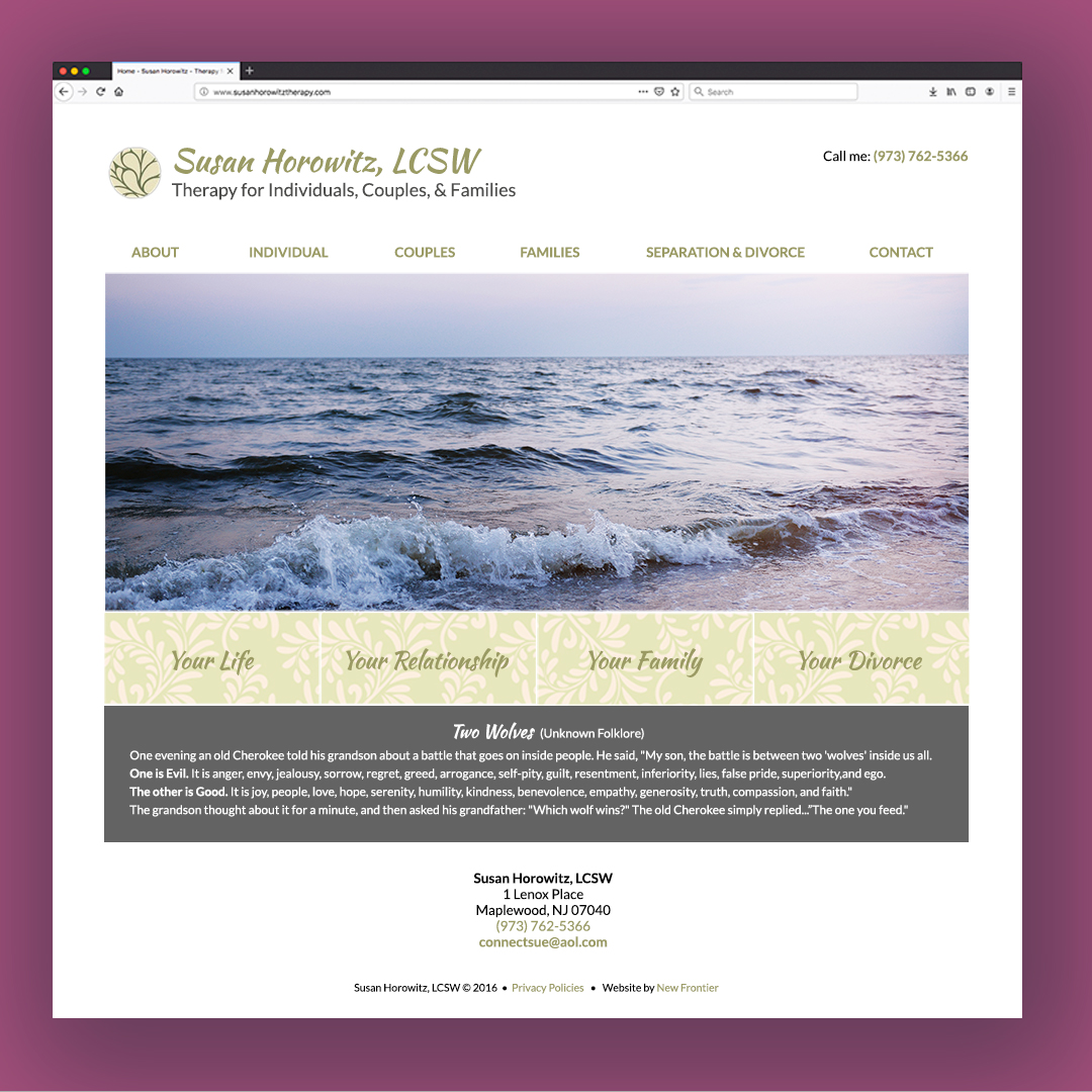 To design an engaging website for Susan Horowitz, a social worker and therapist, we drew upon her enthusiasm for nature photography and creative writing. The homepage features a seascape at sunrise, botanically-patterned buttons, and an allegorical folktale, creating a calming and optimistic atmosphere for patients. Each inner page includes another beach photograph, coupled with an inspirational quote or poetry passage, which extends the serene theme throughout the site. The site serves as not only an informational introduction to Susan and her work, but also sets a tranquil stage for the counseling sessions that may follow.